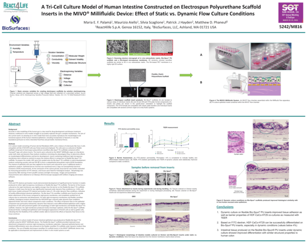 We developed a novel in vitro human intestinal model using a tri-culture system of enterocyte- and goblet-like epithelial cells with human dermal fibroblasts, cultured on flexible Bio-Spun® PU scaffolds within the MIVO® millifluidic organ-on-chip device.