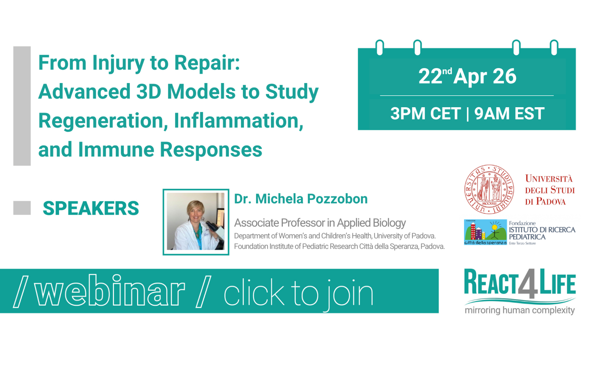 Dr. Michela Pozzobon is Associate Professor in Applied Biology at the Department of Women’s and Children’s Health, University of Padova. She holds a degree in Pharmaceutical Chemistry and a PhD in Tissue Engineering and Regenerative Medicine.